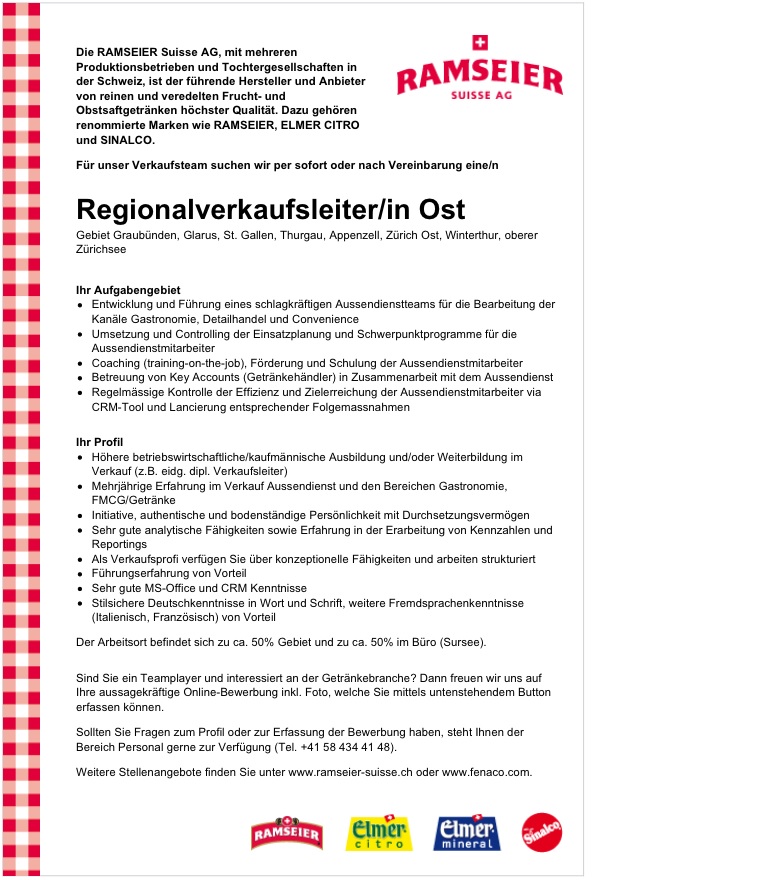 Regionalverkaufsleiter Ost, Ramseier Suisse AG, 6210 Sursee